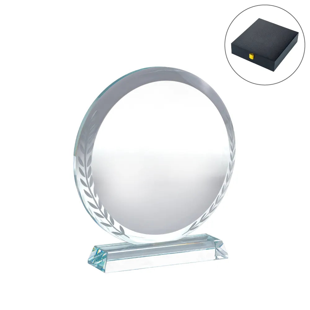 Elegant round crystal award featuring engraved leaf detailing on the sides and a clear glass base. Perfect for recognizing achievements, excellence, and special milestones.